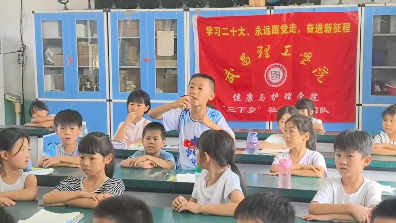 中南在线8月8日消息(记者 祝琳 通讯员 方雅彤 报道 董怡雪 摄影)正值暑假,河南省许昌市鄢陵县南坞镇第三中心小学的教室里却暖意融融。武昌理工学院“医”路向阳支教服务队带来的 “我的牙齿我爱护” 口腔健康课程正在进行,志愿者们用童趣盎然的互动游戏、形象生动的动画演示,将原本专业严谨的护牙知识,悄然转化为孩子们能听懂、愿践行的日常习惯 —— 如何正确刷牙、怎样预防蛀牙、哪些零食会伤害牙齿…… 一个个实用知识点在欢声笑语中深植心间。当七年级(1)班的张瑞婷同学举起手承诺“以后要少吃糖、好好刷牙” 时,健康意识的种子已在课堂悄然播撒。