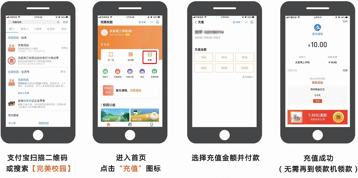 支持实体卡到购电机购电,支持支付宝“完美校园”小程序购电。