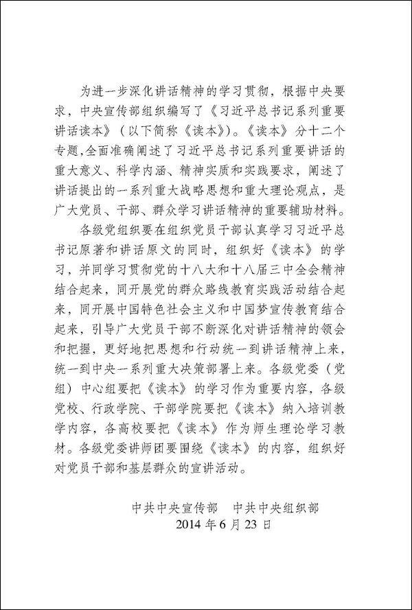 《通知》指出,要深刻认识学习《读本》的重要意义。党的十八大以来,习近平总书记发表系列重要讲话,回答了新形势下党和国家事业发展的一系列重大理论和现实问题,提出了许多富有创见的新思想新论断新要求。讲话涉及改革发展稳定、内政外交国防、治党治国治军各个方面,是新的历史条件下我们党治国理政的行动纲领,是坚持和发展中国特色社会主义的最新理论成果,是夺取中国特色社会主义新胜利、实现中华民族伟大复兴中国梦的强大思想武器。《读本》全面准确阐述了习近平总书记系列重要讲话的重大意义、科学内涵、精神实质和实践要求,阐述了讲话提出的一系列重大战略思想和重大理论观点,是广大党员干部群众学习讲话精神的重要辅助材料。认真组织学习《读本》,对于引导党员干部把思想和行动统一到中央决策部署上来,对于坚持高标准严要求推进教育实践活动,对于凝心聚力推动湖北“建成支点、走在前列”发展进程,都有着十分重要的意义。