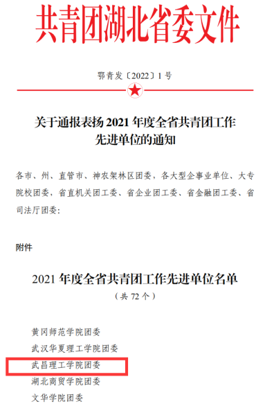 中南在线消息 近日,共青团湖北省委印发《关于通报表扬2021年度全省共青团工作先进单位的通知》,武昌理工学院团委被评为“2021年度全省共青团工作先进单位”。
