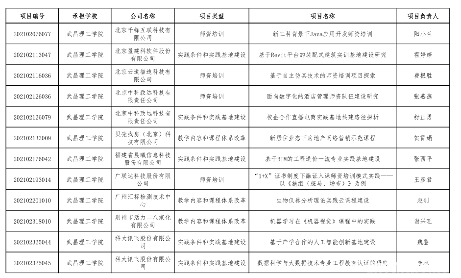 获批的项目包括《新工科背景下Java应用开发师资培训》《基于Revit平台的装配式建筑实训基地建设研究》《基于自主仿真技术的师资培训项目探索》《面向数字化的酒店管理师资队伍建设研究》《校企合作直播电商实践基地共建路径探析》《新居住业态下房地产网络营销示范课程》《基于BIM的工程造价一流专业实践基地建设》《“1+X”证书制度下融证入课师资培训模式实践——以施组(斑马、场布)为例》《生物仪器分析理论实践云课程建设》《机器学习在机器视觉课程中的实践》《基于产学合作的人工智能创新基地建设》《数据科学与大数据技术专业工程教育认证的研究》《数据科学与大数据技术专业工程教育认证的研究》《产学共育打造“人力资源数字化应用”的方向“双师型”教学团队》《基于产教融合的跨境电商实训课程改革》《跨境电商双创基地建设与实践》《应用型本科智能建造专业体系建设》《跨境电商实训实习基地建设研究》《基于JavaEE开发技术的实践教学改革》等。