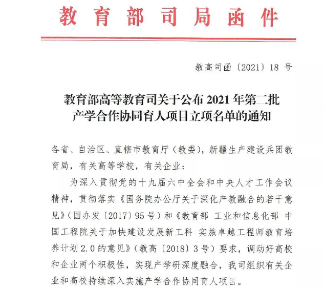 为深入贯彻党的十九届六中全会和中央人才工作会议精神,贯彻落实《国务院办公厅关于深化产教融合的若干意见》(国办发〔2017〕95号)和《教育部 工业和信息化部 中国工程院关于加快建设发展新工科 实施卓越工程师教育培养计划2.0的意见》(教高〔2018〕3号)要求,调动好高校和企业两个积极性,实现产学研深度融合,教育部高等教育司组织有关企业和高校持续深入实施产学合作协同育人项目。