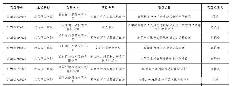 武昌理工学院此次获批的19个项目,涉及“师资培训”“实践条件和实践基地建设”“教学内容和课程体系改革”“创新创业教育改革”“新工科、新医科、新农科、新文科建设”5个项目类别,获得了科大讯飞、贝壳找房、广联达科技等知名企业的支持。