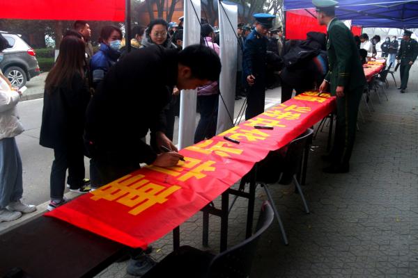 上午8时,退伍军人俱乐部在文化长廊搭建帐篷,通过画板报,横幅等方式来宣传南京大屠杀死难者国家公祭日活动。退役军人俱乐部的成员以整齐的军装、笔直的军姿,吸引了同学的眼球,许多同学上前咨询参观,场面热火朝天,同学们纷纷上前在横幅留下自己的名字,也在便签上留下对于祖国的美好祝福。