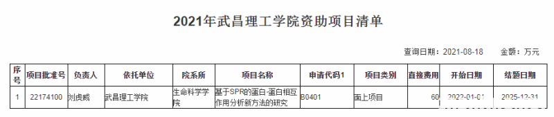 中南在线消息(记者 鲁信 报道)近日获悉,武昌理工学院生命科学学院刘虎威教授申报的项目《基于SPR的蛋白-蛋白相互作用分析新方法的研究》获得国家自然科学基金面上项目立项资助,国拨直接经费60万元,实现了学校国家自然科学基金面上项目的新突破!
