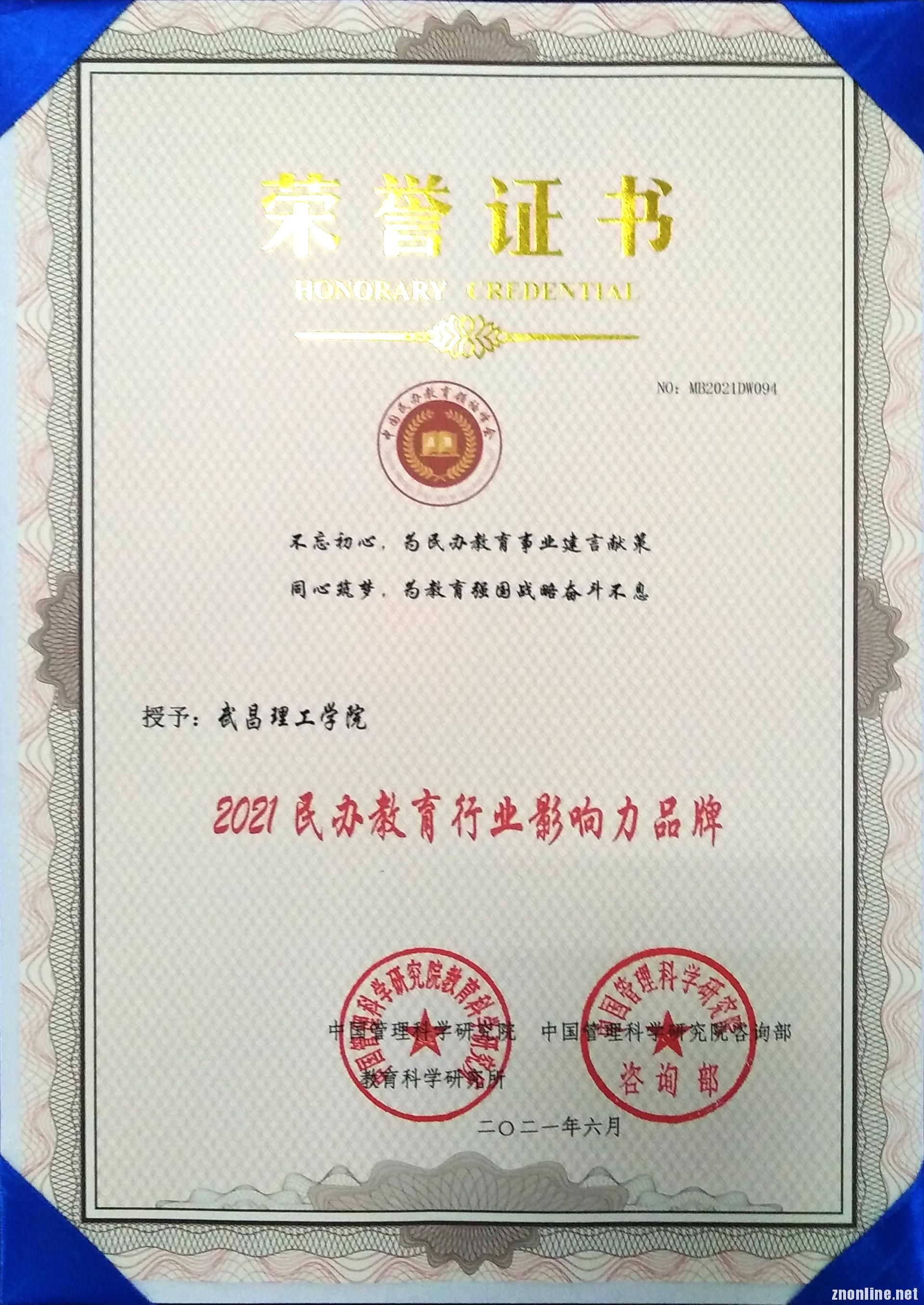 武昌理工学院被授予“2021民办教育行业影响力品牌”