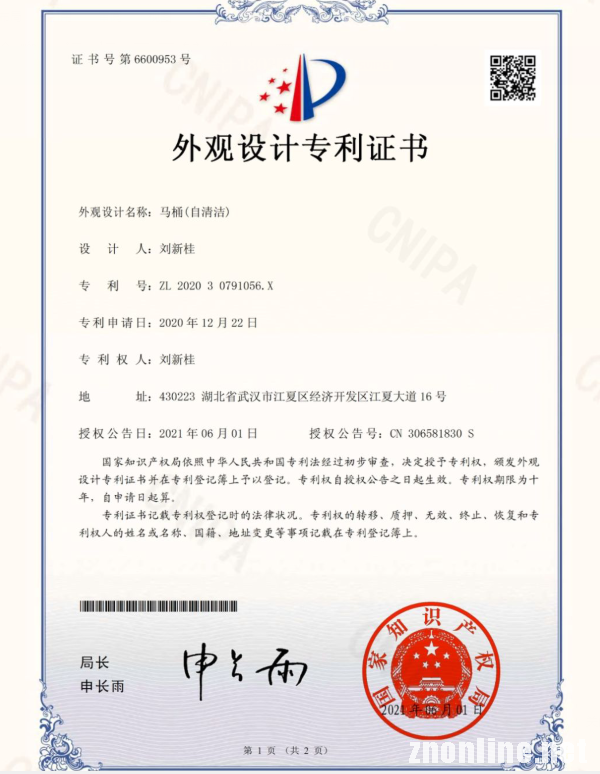对于刷厕所,刘新桂开始思考并联想到马桶:“可不可以改变人刷马桶的格局?让马桶自己运行。”为了解决这一问题,刘新桂查阅了各类资料并且与相关专业老师进行了沟通交流,一点点深入研究,他在不断修改马桶外观的过程中耗费了大量时间和精力,最终历时近一年时间,于2020年12月完成产品设计并且提交了专利申请。随后经过6个月的等待,专利申请终于在近日获批,获得了国家知识产权局颁发的外观设计专利证书。