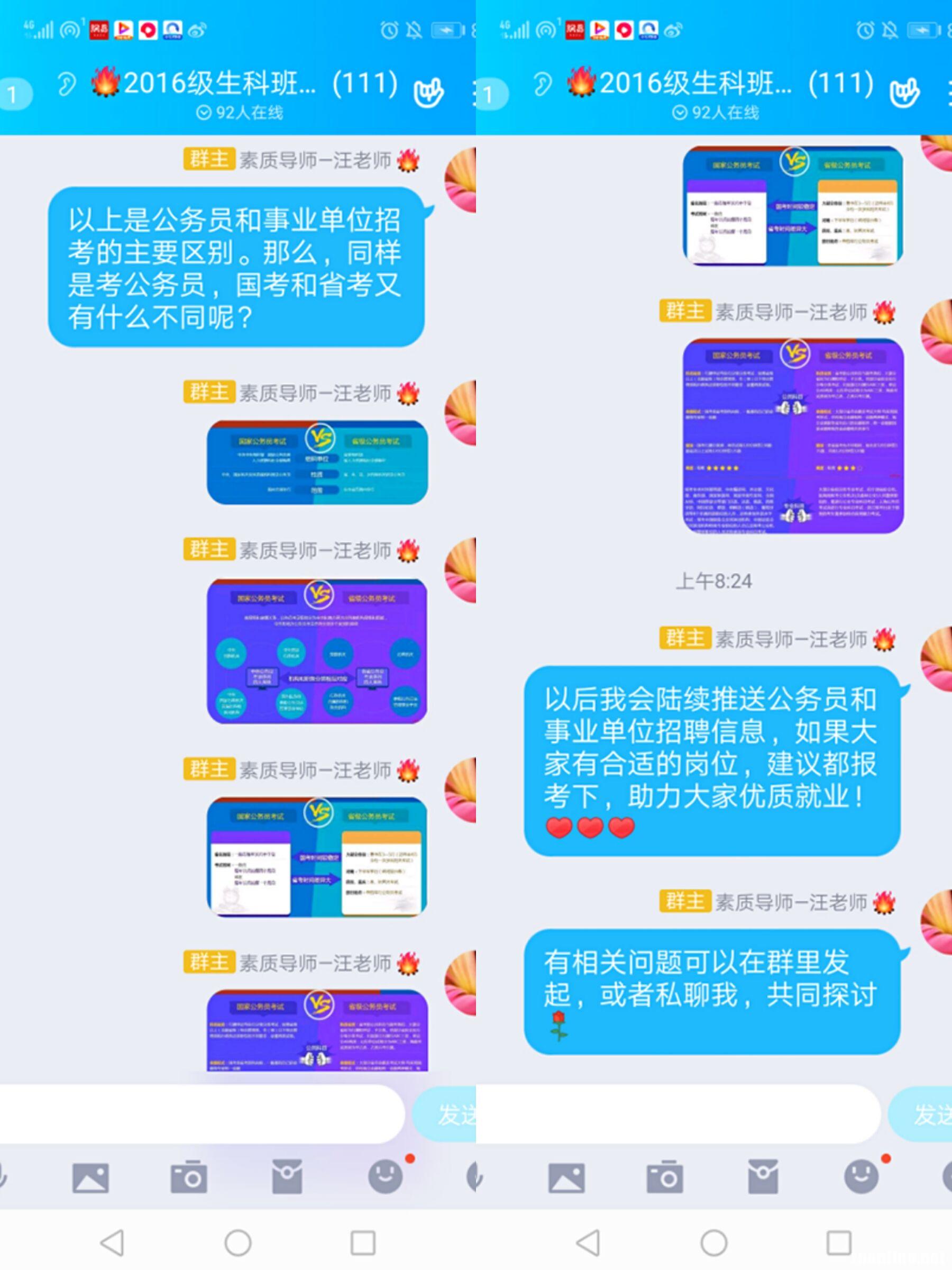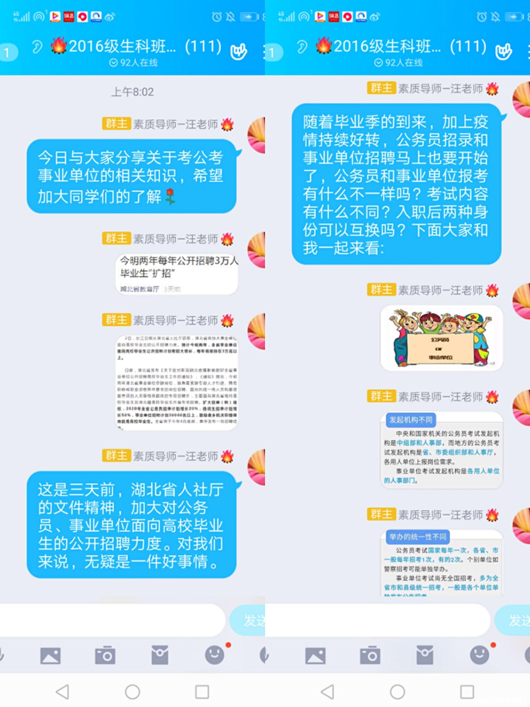 家校联动,共同推进。在掌握部分就业困难学生的具体情况后,素导老师积极同其家长联系,实行“线上+线下“、“学校+家庭”联动机制。在合力作用之下,尽可能转变毕业生就业观望心态,转“危”为“机”,借“机”鼓励毕业生在扩招形势下报考公务员、事业单位,同时与家长双管齐下,督促学生尽快报考参训。 巧用资源,引导报名。为推动2020届毕业生就业工作开展,克服因新冠肺炎疫情带来的就业难问题,学校结合毕业生就业工作实际情况,出台了一系列举措,其中对报考公务员、事业单位的学生开放提供了免费培训平台。在此政策下,学院领导与素导老师通过微信、电话、QQ群等精准动员,有针对性地开展教育引导工作,对学生提出的疑惑和困难及时解决。
