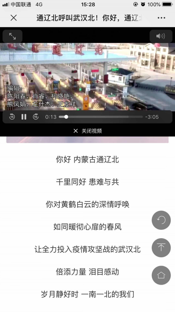 据了解,在疫情之前王龙祥就了解到武汉北与通辽北一直都联系密切。“在疫情发生之后,通辽北的工作人员就非常关注武汉这边的疫情,同时也在一直互帮互助,了解彼此的一些情况。”王龙祥主要是想通过制作这个视频来传达一下两地之间关于疫情方面彼此的关心和帮助。视频中,展现的是习近平总书记三次亲赴一线,身处一南一北的通辽北和武汉北并肩共担祖国交通大发展的重任,各省援鄂的医疗队和那些不留姓名捐献物资的同胞们,武汉与全国4万白衣战士并肩作战,工地建筑者不舍昼夜、焊花飞溅建造医院,医生家属心藏挂念、拥别亲人,人民警察站岗执勤、守护平安,超市营业员坚守岗位、保障供给等等画面,都展现出“千里同好,患难与共”的力量,和“千里驰援,以命相拼”的决心。王龙祥在视频最后写道“感谢通辽北,我们一起加油”来表达自己的美好祝愿。