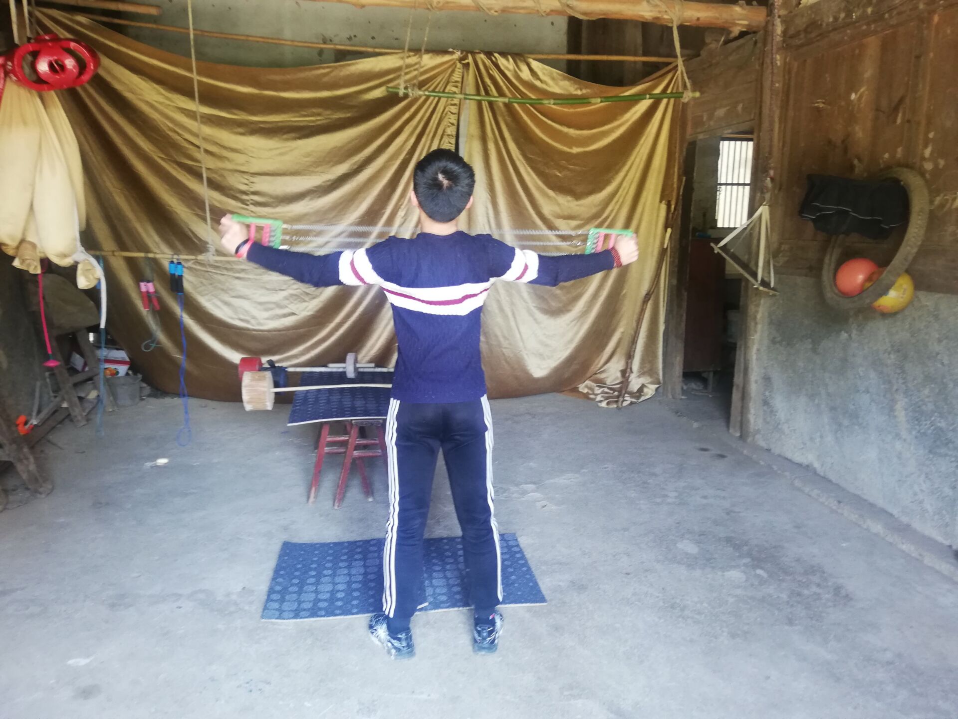 “我们可以自己建一个健身房”,父亲的提议让陈飞飞来了兴致,于是父子二人便开始了自制“健身房”。因为器材有限,制作过程也是困难重重。他们利用身边简易的一些零件并对它们稍加改造,就连一些初中用的跳绳都拿了出来。没有沙袋他们就用破旧窗帘包上沙子做一个沙袋,没有杠铃他们就用钢筋水泥组装一个,用一些废旧机械的轮子组合成腹肌轮,在两面墙之间架起两根横梁再用一些竹子和绳子缠绕在上面做单杆,篮球框则用铁圈再缠上布料固定在墙上做的。考虑到妹妹年纪小,还在一旁用废旧的木板给妹妹做了一个秋千。