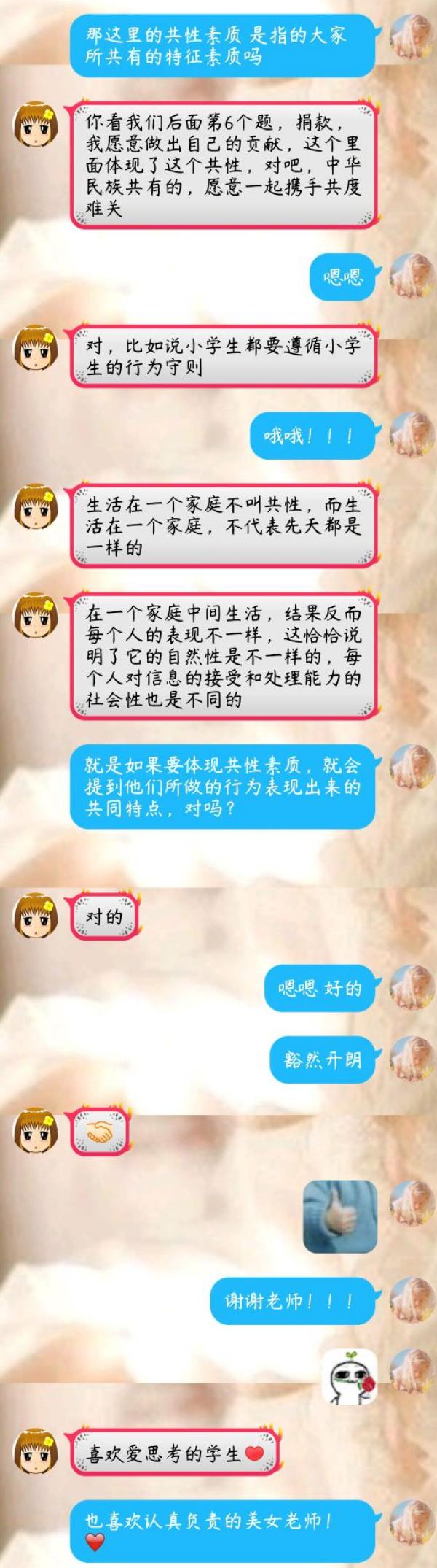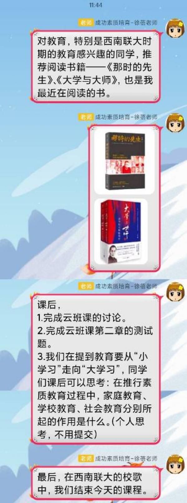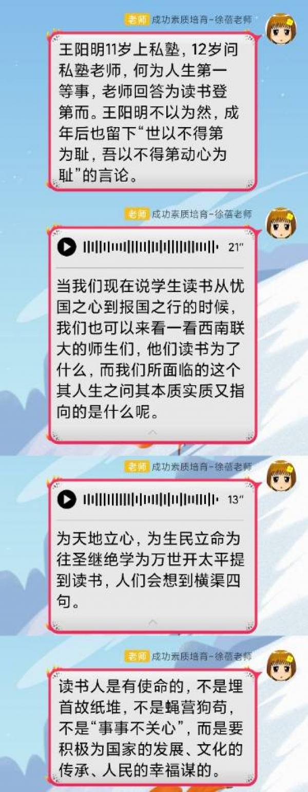 经过反复比较网络资源后,她从“文字”到“文字+语音”到“录屏+文字+语音”的线上授课方式。根据同学们的意见和建议,在我现有条件允许的范围内,不断调整教学方式。据她反映,wifi时常掉线,就买流量;课堂时间有限,有些需要扩充的知识点就用WPS手机录屏;云班课卡顿,就把录屏放在QQ群中,云班课活动不占用课堂时间;用腾讯下载的视频同学们看不了,就买转换器转成MP4格式再发布;有易混淆的疑难知识点,就当堂进行“连线活动”等了解学生掌握的情况并及时讲解,学生有疑惑,就课下一对一释疑,集中反映的问题就在下次课上集体答疑;推荐资源和阅读书籍,让学有余力对所学感兴趣的同学有扩展的空间;课前布置预习任务、课中讲解重要知识点、课后复习检测……师生配合愈加默契,她也逐渐找到了现有条件下比较适合的授课方式。