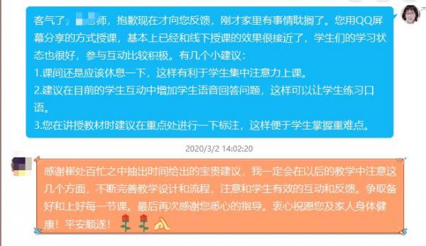 “我主要听的是大英系老师课程,令我十分敬佩,他们上课前一天会将教学设计流程表发给学生,使学生明确学习目标与具体完成任务的时间节点,教学采取 QQ 直播、QQ 语音会议、屏幕分享、插入自录音视频或慕课等各种教学方式,提高教学的吸引力,激发学生参与积极性。”教学质量管理处处长崔清评价道。