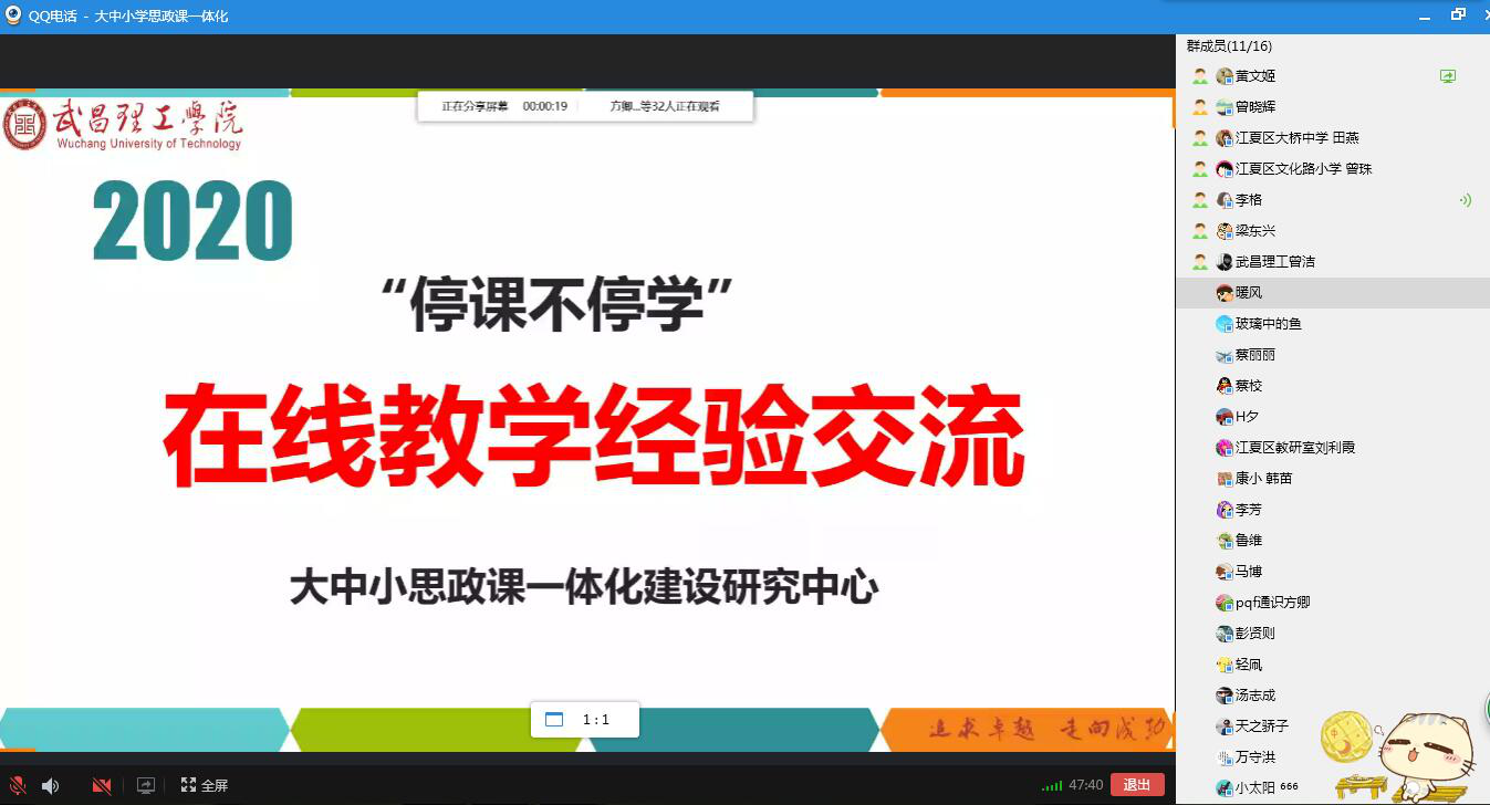 疫情当前,“停课不停学”成为学生居家常态,“教什么”、“用什么教”则是摆在学校、老师面前的一大问题。3月9日,武昌理工学院大中小学思政课一体化建设研究中心召开大中小学思政课教师线上教学经验交流会,分享在创新线上教学形式、理论联系实际等方面取得的好的做法、新的经验。大中小学思政课一体化建设研究中心全体人员参会,会议由研究中心主任蔡贤浩教授主持。