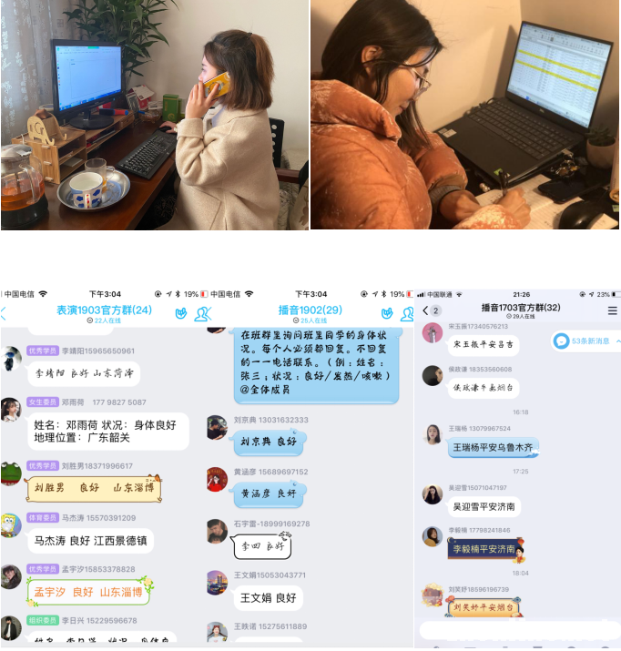 该学院的素质导师们坚持把学生安全和健康放在首位,按照党中央的部署和校党委的安排,坚守工作岗位。全面掌握学生情况,了解学生动态,及时做好记录,以高度的责任心积极落实最新决策部署。在班级群动员学生每日报平安,做到各班团支书每日一汇报,每日一统计。