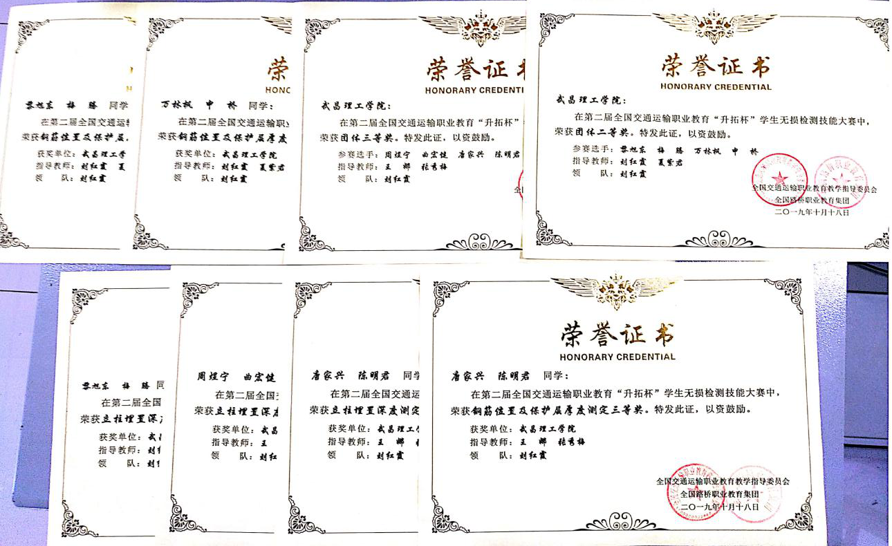 在此次名校云集的大型赛事上,武昌理工学子最终斩获8项大奖。具体奖项包括团体奖:一个团体二等奖,一个团体三等奖;单项奖:两个“钢筋位置及保护层厚度测定一等奖”,三个“立柱埋置深度测定二等奖”、一个“钢筋位置及保护层厚度测定三等奖”。