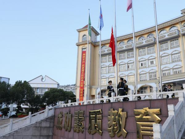 升旗仪式完毕,学工处李金永处长在国旗下讲话,他说:“今日之中国,繁荣昌盛;今日之中国,傲然屹立在世界民族之林。自从有了中国共产党,中国革命的面貌焕然一新,在中国共产党领导下,新中国成立了。今日,是新中国成立70年华诞,70载沧桑巨变,70载壮丽征程,新中国从被各国冷落到逐步和各国签订友好条约,到逐步和各国合作发展,到‘一带一路’的开展,中华民族开创了令世界瞩目的中国奇迹,向中华民族伟大复兴梦昂首迈进。少年智则国智,少年强则国强。”他表示:“第一要坚定爱国主义信念,青年要爱国和爱党、爱社会主义相统一,祖国的命运和党的命运、社会主义的命运是密不可分的。只有坚持爱国和爱党,爱社会主义相统一,爱国主义才是鲜活的真实的。第二要践行校训精神,要求我们对待工作、对待学习、对待自己的行为、对待自己的思想境界、对待自己的文明素养等,都要努力做到最好、做到极致、做到完美。”