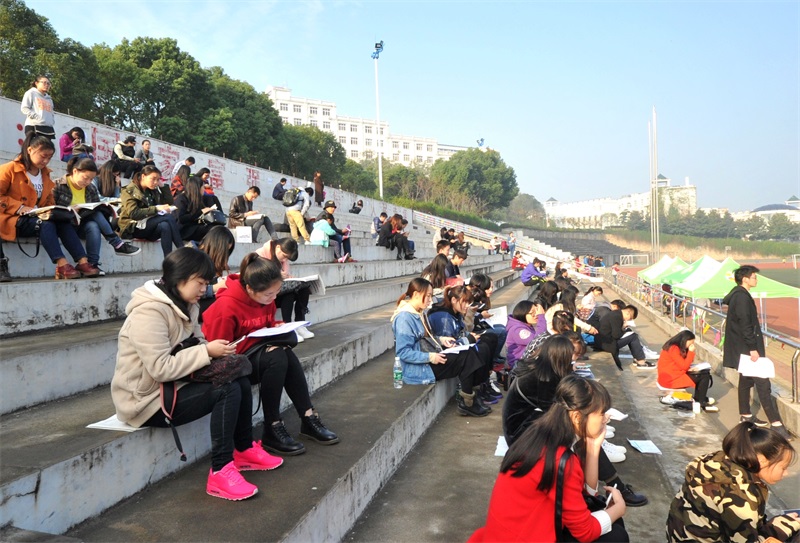 绵密沁凉的细雨悄然而至,无声地打落在步履匆匆的学子肩上。淋湿了四月的轮廓,浸透了人心的念想,校园中的广播声却也停留不住欢快的步伐,只因身心早已有所归属。这正是武昌理工学院图书馆一楼的自习室。