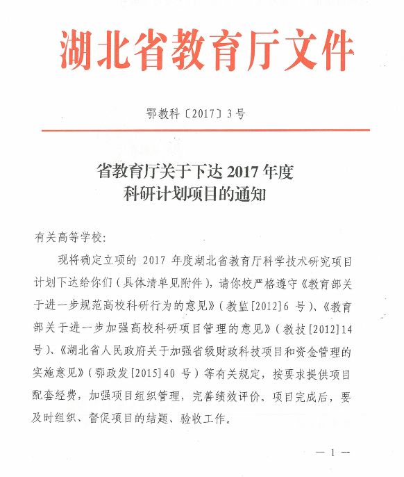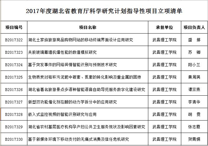 中南在线7月10日消息(记者 鲁信 报道)近日,湖北省教育厅下发了《2017年度湖北省教育厅科学研究计划指导性项目立项清单》,武昌理工学院9项课题获批立项,是湖北省同类高校中获批数量最多的高校之一。