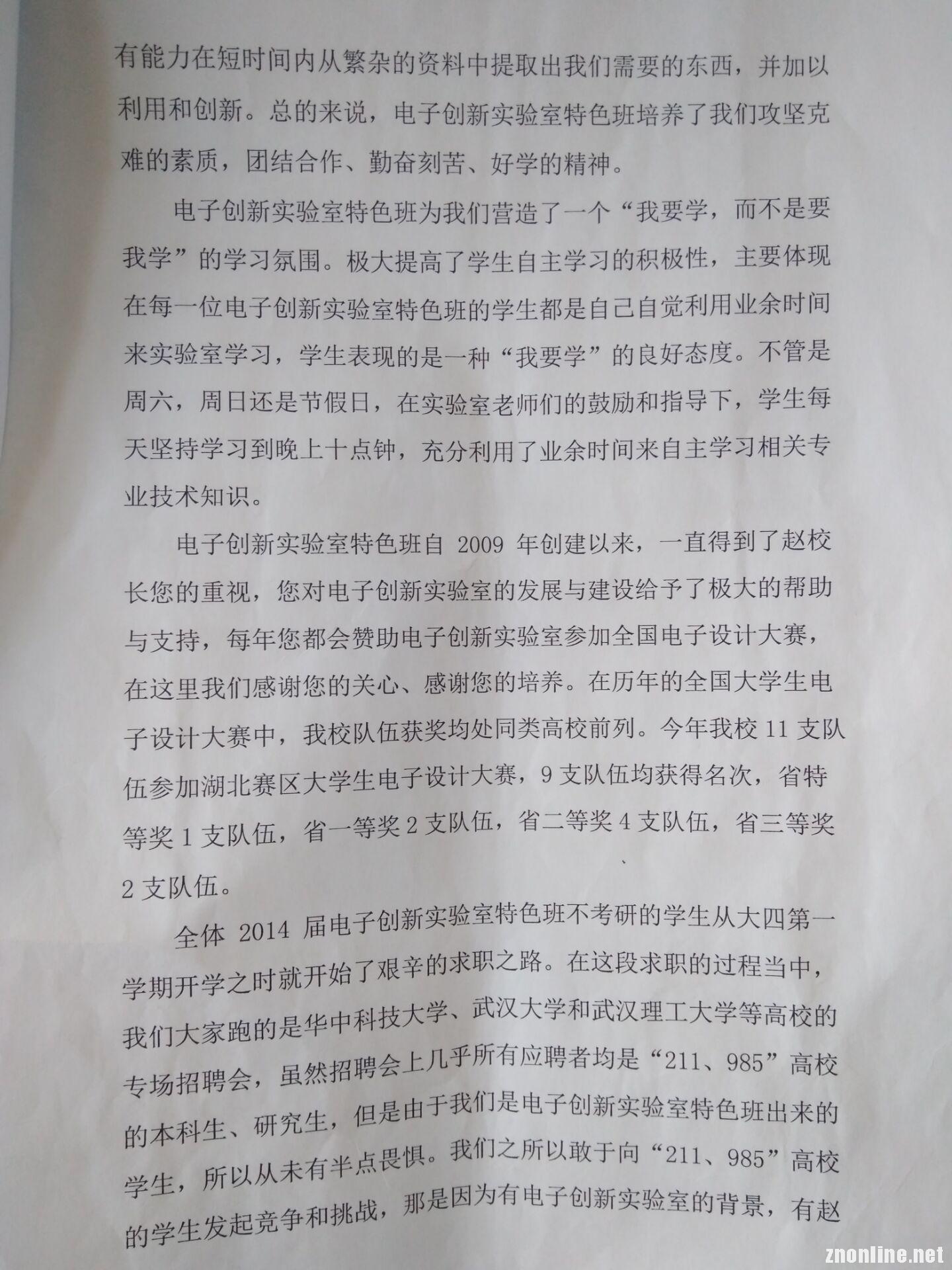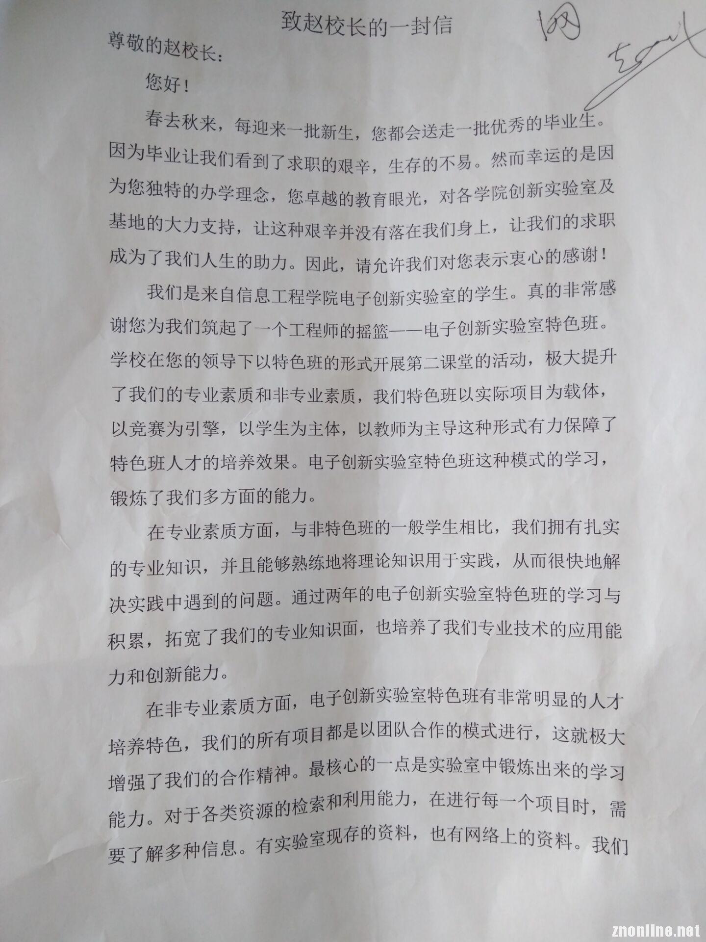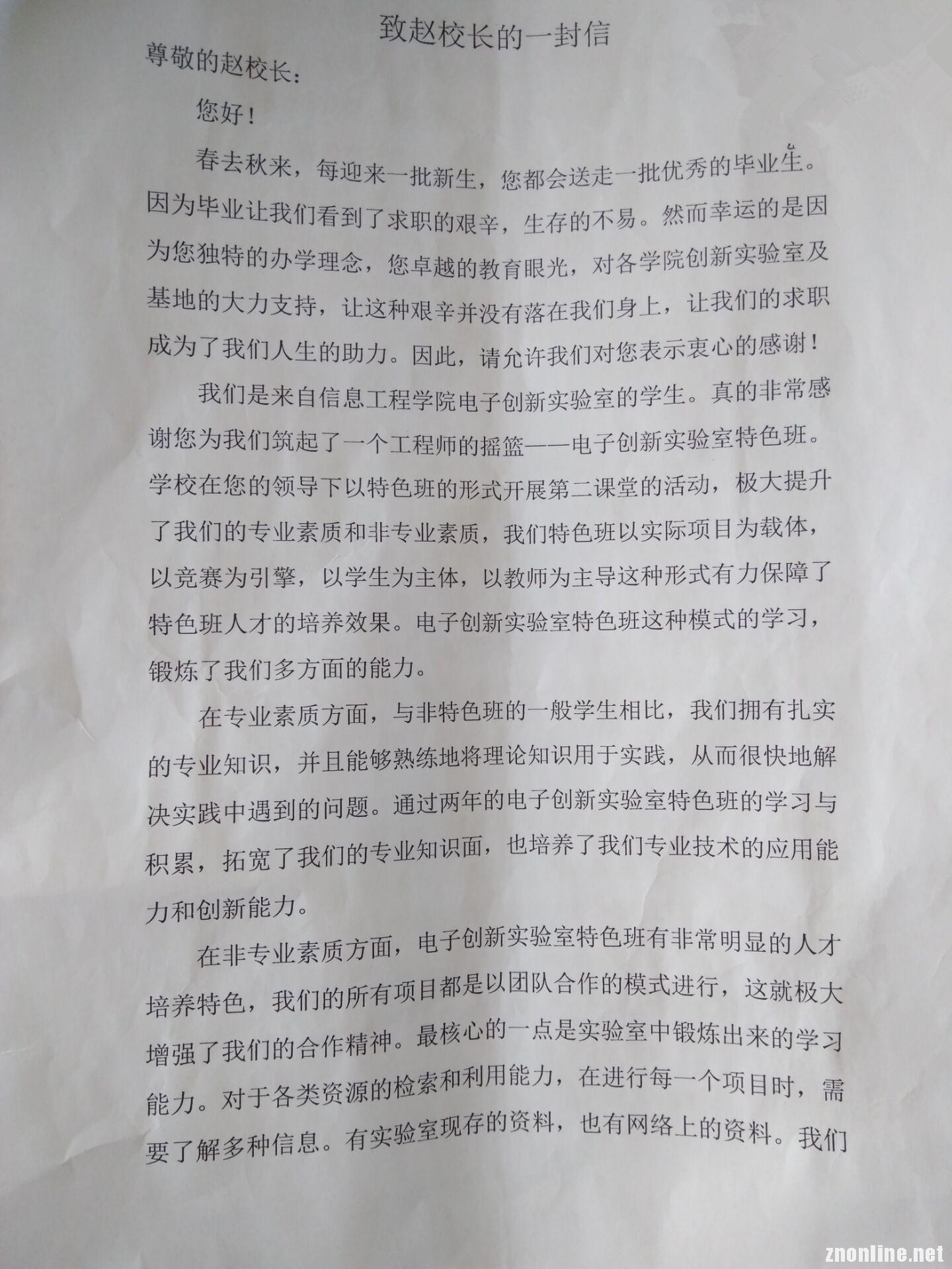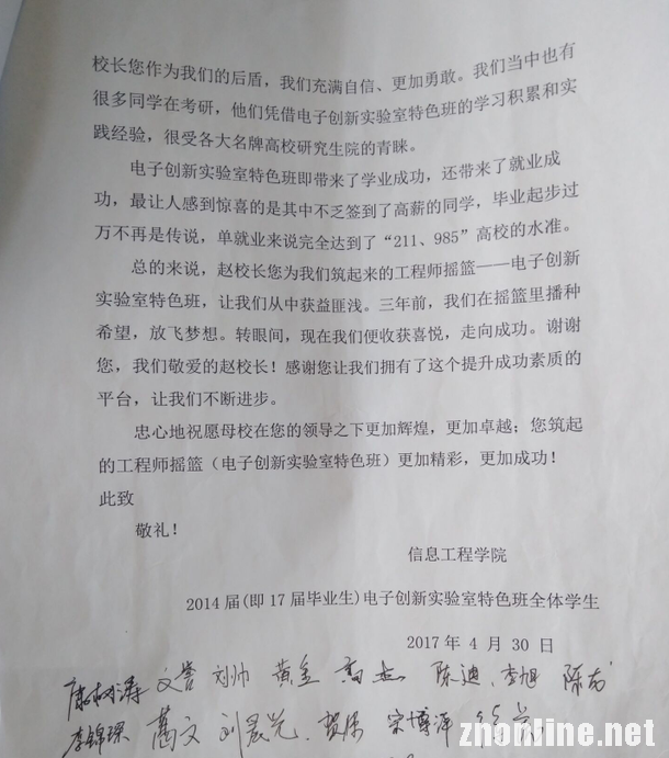 中南在线5月10日讯(记者 鲁信 报道)“虽然招聘会上几乎所有应聘者是‘211、985’高校的本科生、研究生,但是由于我们是从电子创新实验室特色班出来的学生,所以从未有半点畏惧。”近日,武昌理工学院校长赵作斌教授收到了一封特殊的“感谢信”,这封信来自该校电子创新实验室特色班2017届的毕业生。据了解,这已是该特色班连续五届学生给校长写信。