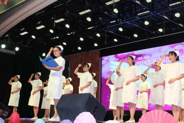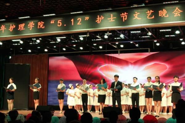晚会节目形式多样,分为歌曲、舞蹈、音乐剧等共12个节目,活动以一首欢快的舞蹈《欢聚一堂》拉开帷幕,飞扬的舞姿引来同学们的阵阵掌声。接下来由李强副院长、童玲老师等带来的朗诵《那个名字》歌颂出了护士们的热情与慈爱,赞扬了坚持在岗工作的护理人员,深深打动了台下观众,引起同学们的共鸣。随后一首深情的英文歌曲抒发了护理人员的职业信仰,赢得了如潮水般的掌声,将活动推向高潮。而护理学院大三学生黄金花等表演的乐器独奏《荷塘月色》,悠扬婉转的乐音获得大家一致好评。随后,一批批身穿护士服,形态优雅的护理学生们上台接受表彰,为同学们展示出了护理学子的风采,院长杨和平教授为同学们颁奖,卢人玉教授等10位教师为受表彰学生授帽。此外,由护理1601、1602、1603班带来的合唱《中国护士之歌》,整齐的歌声,恢弘的气势赢得了现场如潮般的掌声。