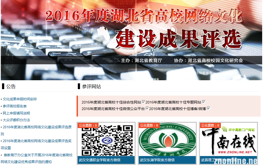 评选设湖北省网络文化建设优秀成果奖、单项奖、特别奖、优秀指导教师奖四类奖项。其中湖北省高校网络文化建设优秀成果奖包含“十佳综合性网站”、“十佳专题网站”、“十佳博客/微博”、“十佳移动公众平台”。武昌理工学院积极申报,四项成果申报成功。