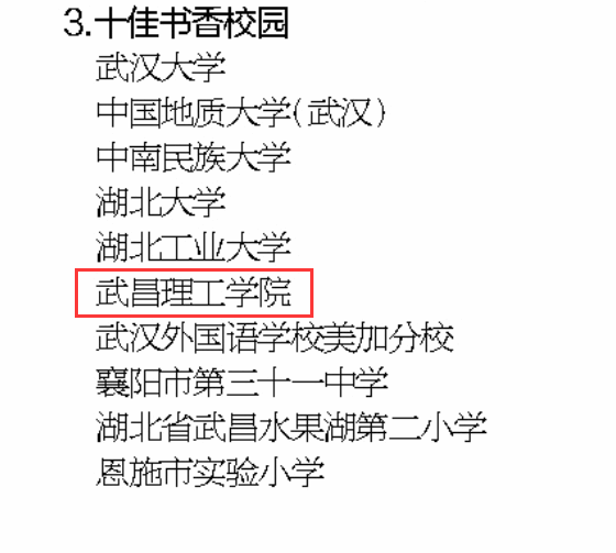 为鼓励先进,总结推广各地各部门的好做法、好经验、促进全民阅读活动进一步深入开展,湖北省全民阅读活动领导小组办公室举办了此次评先争优表彰活动。活动分为申报、推荐、评选三个阶段,于2月25日正式启动,历时近两个月共评选出了“十佳书香机关”、“十佳书香企业”、“十佳书香校园”等16个奖项,160个先进单位和个人受到表彰。武昌理工学院与武汉大学、湖北省武昌水果湖第二小学等10所省内大、中、小学获得“十佳书香校园”荣誉称号,获奖名单中有6所为高校,武昌理工学院成为该奖项中唯一获奖的民办高校。