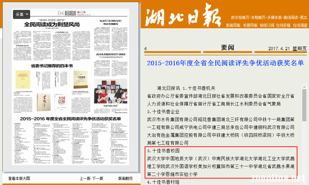 中南在线4月22日讯 (记者 张蕾 鲁信 报道)4月21日,在第22个世界读书日到来之际,从湖北省全民阅读活动领导小组办公室传来好消息,2015-2016年度全省全民阅读评优争先活动获奖名单公布,武昌理工学院荣获湖北省“十佳书香校园”称号。“十佳书香校园”的获奖名单中涵盖了省内的大、中、小学,武昌理工学院成为我省唯一获此殊荣的民办高校,全省仅6所高校获评。