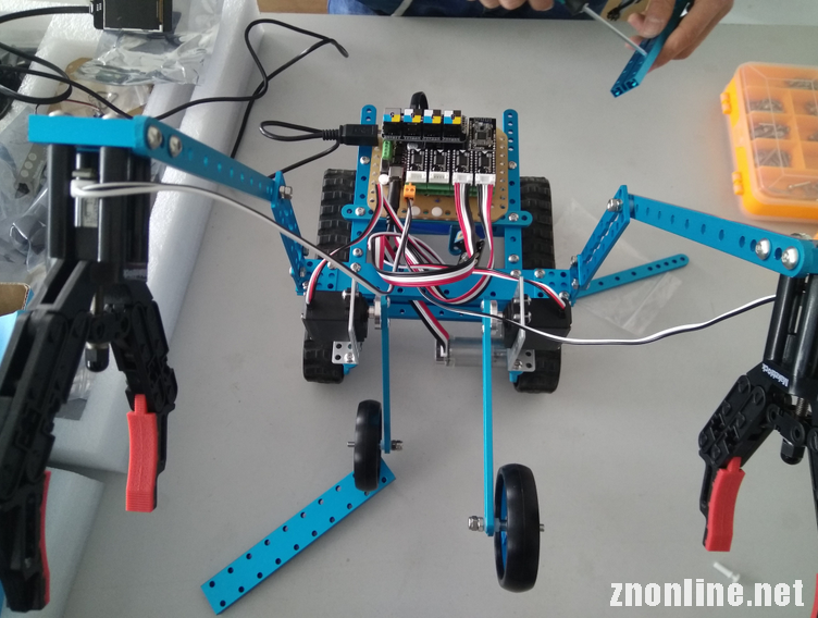 据了解,他们设计的这个按摩机器人身形小巧,长和宽各20厘米,高度可达30-40厘米。电源、线路、控制程序和接收模块等几个部分组成整个机器人的核心部位,电源和线路保证机器人正常运转,控制和接收部分是调解按摩机器人按摩力度的重要零件。按摩机器人以mBOt黑色小车作为底座方便移动,底座每边都装置两个小轮来保持稳定性,通过支架零件固定两个机械手和两个小轮,机械手设置在两侧部位,而用来“捶背”的小轮设置在中间部位,两种程序便可以同时运作,互不干扰运作。机械手模仿手臂运动,使机械手开合达到捏背的目的,机械手是按摩机器人的主要执行部件,通过按摩机器人的操作,可以选择捶背、捏肩或者又捶背又捏肩的程序,而小轮上下运动则是模仿捶背的动作。