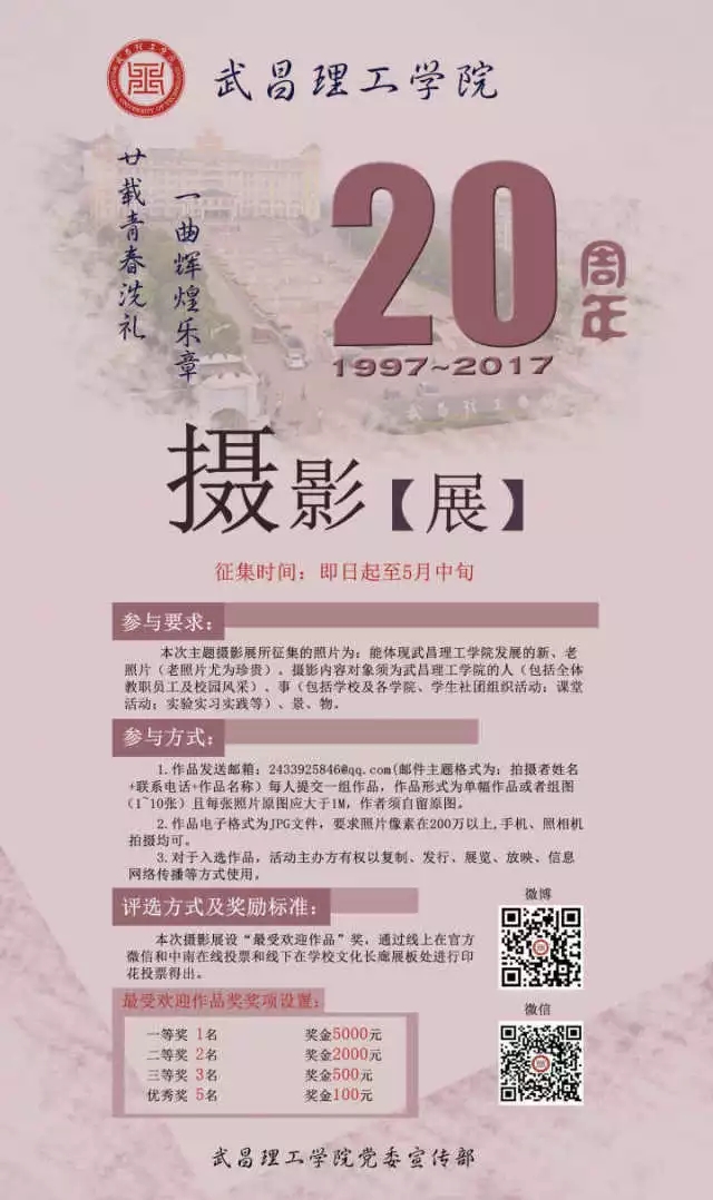 武昌理工学院二十周年校庆主题摄影展照片征集活动启动 设最受欢迎作品奖 最高奖励5000元