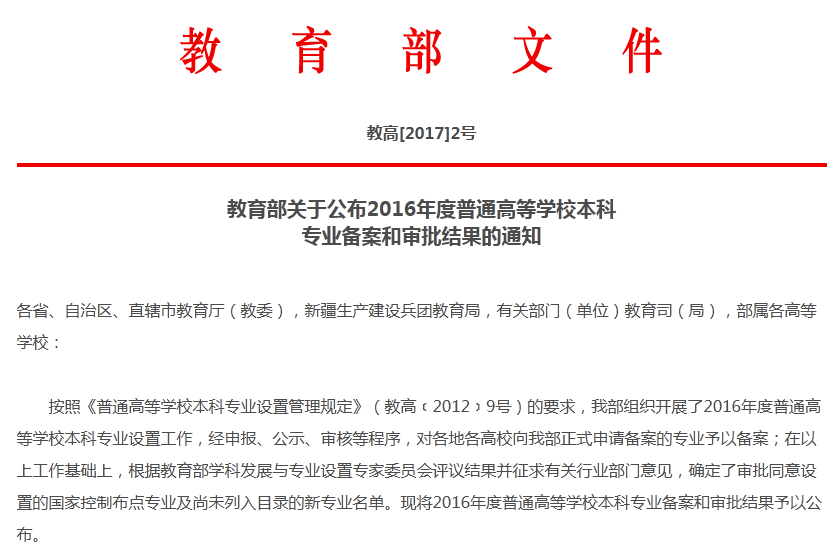 按照《普通高等学校本科专业设置管理规定》(教高?2012?9号)的要求,教育部组织开展了2016年度普通高等学校本科专业设置工作,经申报、公示、审核等程序,对各地各高校向教育部正式申请备案的专业予以备案。