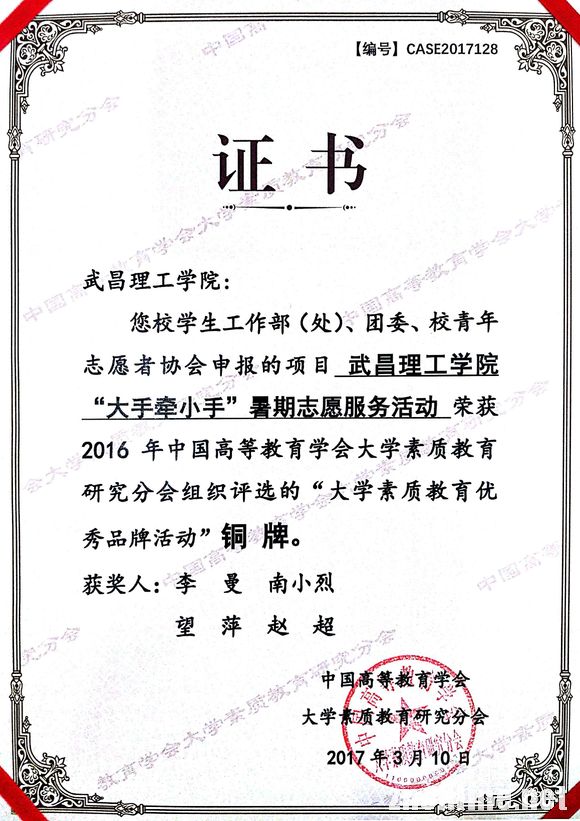本次大会的主题是“素质教育与一流大学建设”,其议程包括常务理事会、工作坊、圆桌会议、开幕式、大会报告以及五场专题论坛。此外,本次大会还宣布了“大学素质教育优秀品牌”活动评选结果并颁发证书。武昌理工学院“成功素质展示节”、“大手牵小手暑期志愿服务活动”等两项活动均获铜牌。
