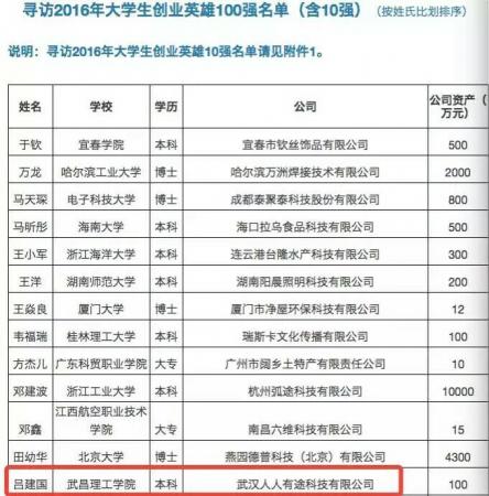 武昌理工学院城市建设学院土木1402班学生吕建国凭借“人人有途”这一创业项目成功入围“2016年大学生创业英雄100强”。据了解,人人有途科技有限公司是通过校园兼职、线下沙龙、学习讲座、比赛等形式对大学生职业生涯进行分析,发现追踪、评价、甄选和提供最优秀的人才,并推荐给企业,最终实现让学生省钱、赚钱、高薪就业的互联网校园成长平台。该公司于2016年4月成立,还曾受中国青少年新媒体协会、青创工场邀请在复旦大学作为湖北省唯一入选项目路演,并当场受到众多投资人的肯定和投资意向。创始人吕建国受邀与名校贷CEO曾庆辉、青创工场总裁、凯石投资合伙人俞铁成等大咖共进晚餐指导项目,对接资源,成为青创工场武汉官方合作伙伴。不仅如此,他们还拿到了种子轮的投资,联合了武汉两家大型公司,武汉博英人力资源有限公司和武汉众星伯乐人力资源管理有限公司,一起做校园猎头项目,改善大学生就业和人才市场招聘之前信息资源不对等的问题,实现学生和企业的共赢。