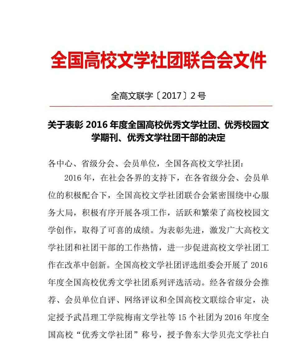 2016年,在有关部门的指导下,在各中心、省级分会、会员单位的积极配合下,全国高校文学社团联合会紧密围绕高校文学社团发展大方向,积极开展各项活动,活跃和繁荣了高校校园文学创作,推动了新时期校园原创文学进度,取得了可喜的成绩。为表彰先进,激发广大社团的工作热情,进一步促进高校文学社团工作在改革中创新。全国高校文学社团评选组委会开展了2016年度全国高校优秀文学社团系列评选活动。经各省级分会推荐、会员单位自评、网络投票和全国高校文联综合审定,决定授予武昌理工学院梅南文学社等15个社团为2016年度全国高校“优秀文学社团”称号,授予武昌理工学院学生黄召慧等35名干部为2016年度全国高校“优秀文学社团干部”称号。