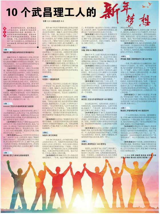 每当新年来临之际,我们都会在心中盘点过去,看看有多少还未来得及实现的梦想与愿望。面对新的一年,大家依然满怀期待和憧憬,希望在新的一年里梦想能够照进现实,实现新的突破。于是,大通社的同学们分别采访了10个武昌理工人,分享他们过去的点滴故事,倾听他们2017年的新年梦想。