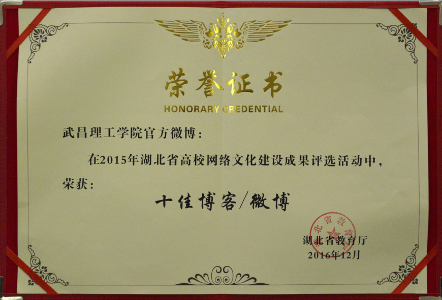 在由省教育厅主办的2015年度湖北省高校网络文化建设成果评选中,经大众投票、专家评审等环节,武昌理工学院官方微博获评“十佳博客/微博”,是全省同类高校中唯一入选的官方微博,全省仅4个高校官方微博获此殊荣。武昌理工学院新媒体中心主任刘明杨还荣获“优秀指导教师”称号。