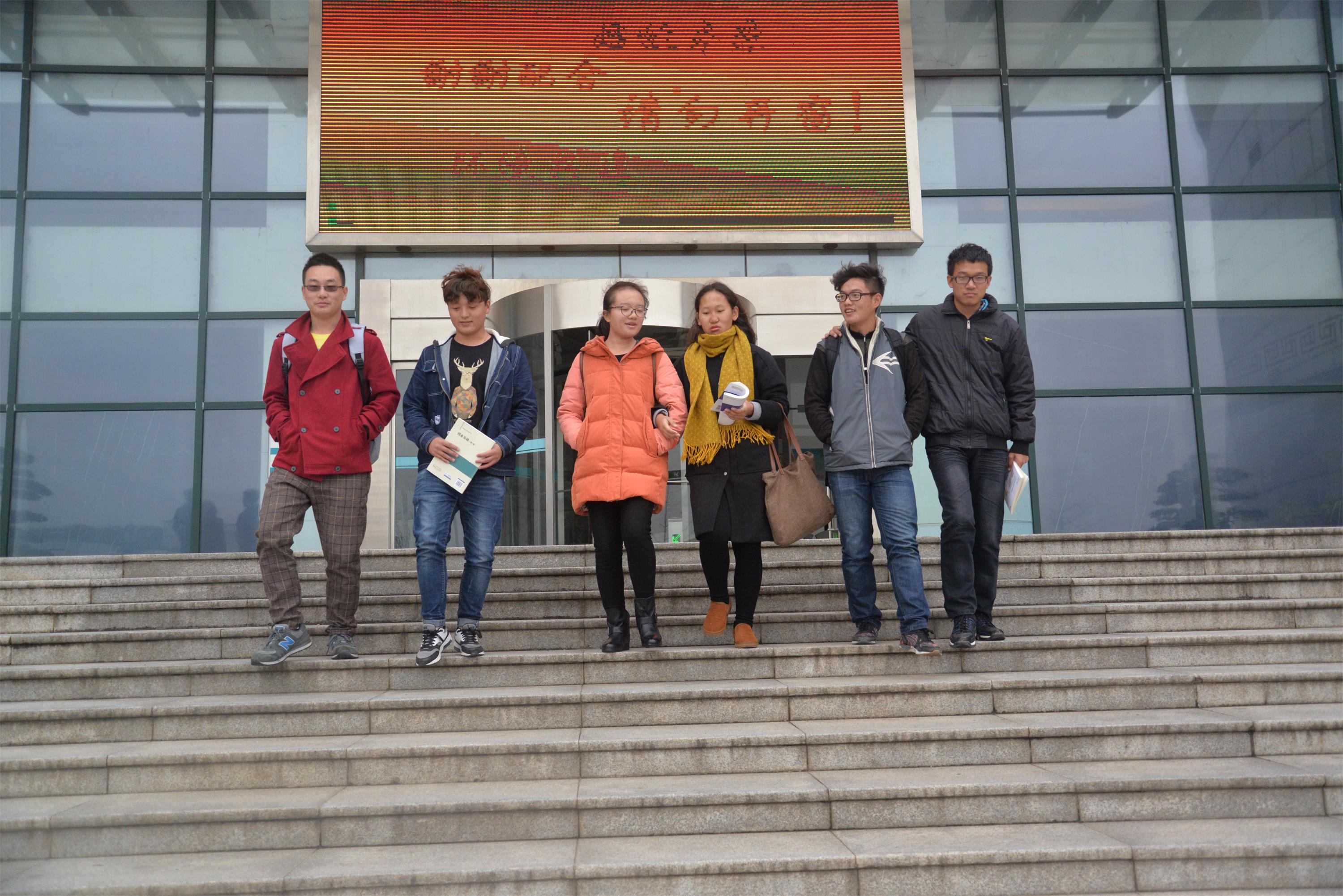 从左至右:蒙古族刘飞、藏族平措洛追、汉族女生、藏族格桑、苗族潘舒航、维吾尔族史燕奎几位同学在图书馆学习完后一起离开