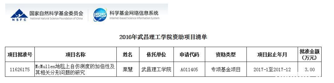 中南在线11月24日消息(通讯员 胡浩 报道)日前,从国家自然科学基金委员会获悉,武昌理工学院信息工程学院栗慧博士主持的《McMullen地毯上自仿测度的加倍性及其相关分形问题的研究》成功获批2016年度国家自然科学基金专项基金项目,实现了该校国家自然科学基金项目新的突破。
