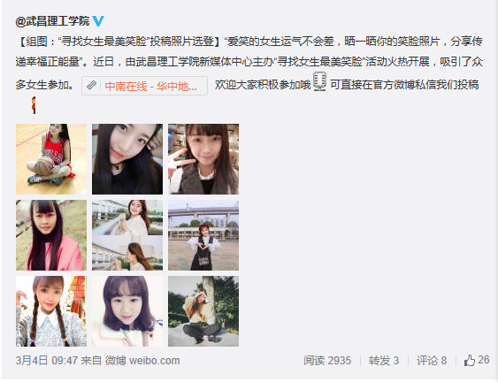 “爱笑的女生运气不会差,晒一晒你的笑脸照片,分享传递幸福正能量”。近日,由武昌理工学院新媒体中心主办“寻找女生最美笑脸”活动火热开展,吸引了众多女生参加。