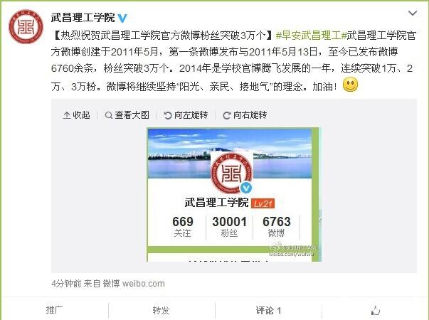 武昌理工学院官方微博粉丝突破3万个影响力稳居全国高校50强