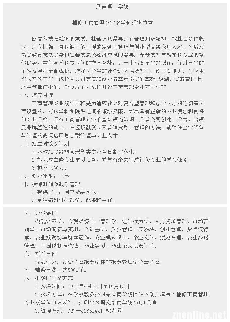 武昌理工学院辅修工商管理专业双学位招生简章:
