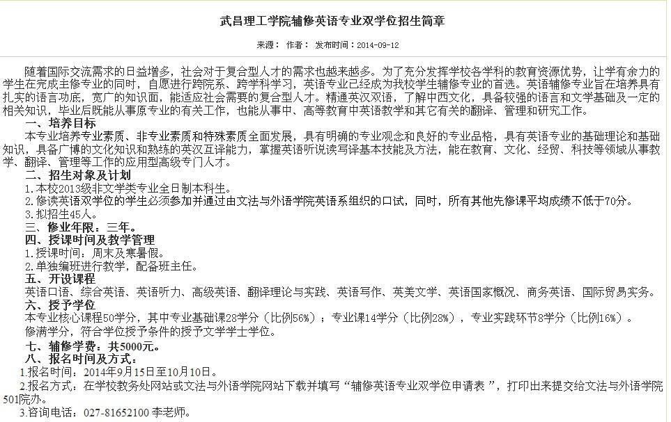 武昌理工学院辅修英语专业双学位招生简章: