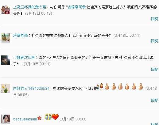 陕西电视台“天天网事”栏目主持人西平评论认为,在施以援手的美丽,借助微博的传播开来,细心源自爱心,美丽瞬间就此定格,不仅呵护了伞下老者,更温暖了万千网友。雨伞撑起的“情”天是对善举最朴实的褒扬,看似举手之劳,却是人格的平等相待,撑起的一把伞是弱者的一片天。