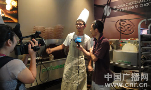 主持人白宇(右)和大学生张勇亮在比利时欧盟馆录制节目。穿上大师服装制作巧克力的张勇亮兴奋不已。
