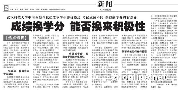 中南在线消息 据中国教育报8月14日热点透视栏目专稿:今秋,武汉科技大学中南分校将推行“成绩换学分”,消息传出,引发全社会广泛关注。作为对高校传统的“学时换学分”学生评价模式的重大改革,“成绩换学分”一旦实施,对于同一门课程,学生考试得60分与90分获得的学分将会不同,而这又会直接影响到学生的毕业。专家认为,“成绩换学分”能否真正调动大学生学习积极性,有待时间的验证。