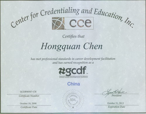 中南在线讯 据商学院网站消息 近日,武汉科技大学中南分校商学院陈洪权副教授收到了由美国咨询师认证管理委员会(NBCC)下属教育认证中心(CCE)颁发的全球职业规划师(GCDF)认证资格证书。 GCDF 是Global Career Development Facilitator的简称,又名全球职业规划师,是美国咨询师认证管理委员会 (NBCC)推广的一个全球性的认证体系,专门用来培养职业发展、职业生涯规划和职业咨询领域中的专业人员。目前,GCDF认证已在美国、加拿大、新西兰、中国等20个国家推行,成为国际上职业发展、职业规划、职业咨询和职业生涯规划的行业性认证。