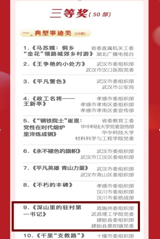 近日,全省第二十二届党员教育电视片观摩交流活动获奖名单出炉,武昌理工学院党委联合恩施州委组织部等共同策划制作的专题片《深山里的驻村第一书记》,荣获全省三等奖。此片是全省党员学习教育指定宣传片,全省仅有90部作品获一二三等奖。该专题片还将在湖北省党员干部现代远程教育平台、荆楚旗帜网和《旗帜》电视栏目等进行展播。