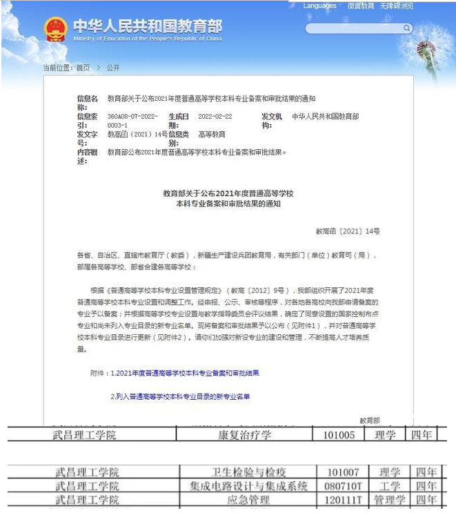 近日,教育部下发《教育部关于公布2021年度普通高等学校本科专业备案和审批结果的通知》(教高函〔2021〕14号),武昌理工学院申报的康复治疗学、卫生检验与检疫、集成电路设计与集成系统、应急管理四个本科专业成功获批。