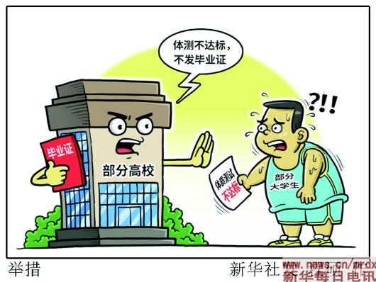 为“拯救”下滑的大学生体质,新华社记者了解到,部分高校陆续祭出“杀手锏”:体测不达标,不发毕业证。还有高校用APP考核学生日常锻炼情况,纳入体育课考试成绩……