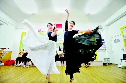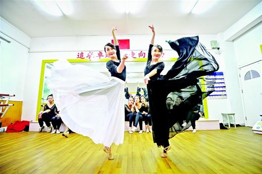 两姐妹在学校里人气也很旺,被学生昵称为“?老师”、“倩老师”。“别看老师们温柔和气,在她们这别想偷懒。”正在上鲁文?的技术技巧课的大一学生杨馨说,为了督促她们练功,老师特意建了微信群,每人每天必须上传练功视频,她看后进行指导。“一次不交,这门课就别想及格了!不过真的有用。”她说,艺考时她都没法搬腿,现在已经OK了。