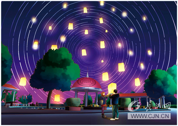夜晚的光明顶,是静谧的,无数盏孔明灯漫天飞舞,飞向天空,飞向银河,飞向宇宙;人来人往的大学门口,新生正进入象牙塔;勤人坡上的夕阳,充满梦幻和想象;图书馆前的草坪有搭帐篷露营的,有放风筝的,有专注学习的,还有萌犬叼着网球在玩耍;山水环绕,绿荫遍地,白云飘飘,小鸟依依,远处的运动场上热闹非凡;篮球场上的球即将飞入篮框,众人瞩目,就连时间也在那一刻驻足观望,等待着精彩呈现;文化长廊,因经常有社团在路旁搭帐篷举办社团活动得名……据了解,每一条附有手绘明信片的微博都配了语言优美的旁白,文采飞扬,进一步增强了明信片的文化内涵。